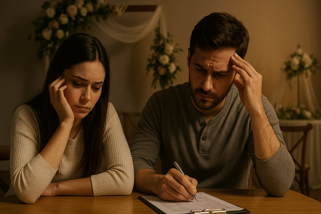 Julia e Pedro economizaram durante 3 anos para o casamento. Com uma renda familiar de R$ 6 mil, conseguiram guardar R$ 20 mil. Orçamento inicial da festa: R$ 25 mil. Dois meses antes da cerimônia, começaram a acompanhar casamentos de amigos nas redes sociais. O resultado? Dobraram o orçamento da festa, contraíram um empréstimo pessoal e começaram a vida de casados devendo R$ 30 mil para o banco.