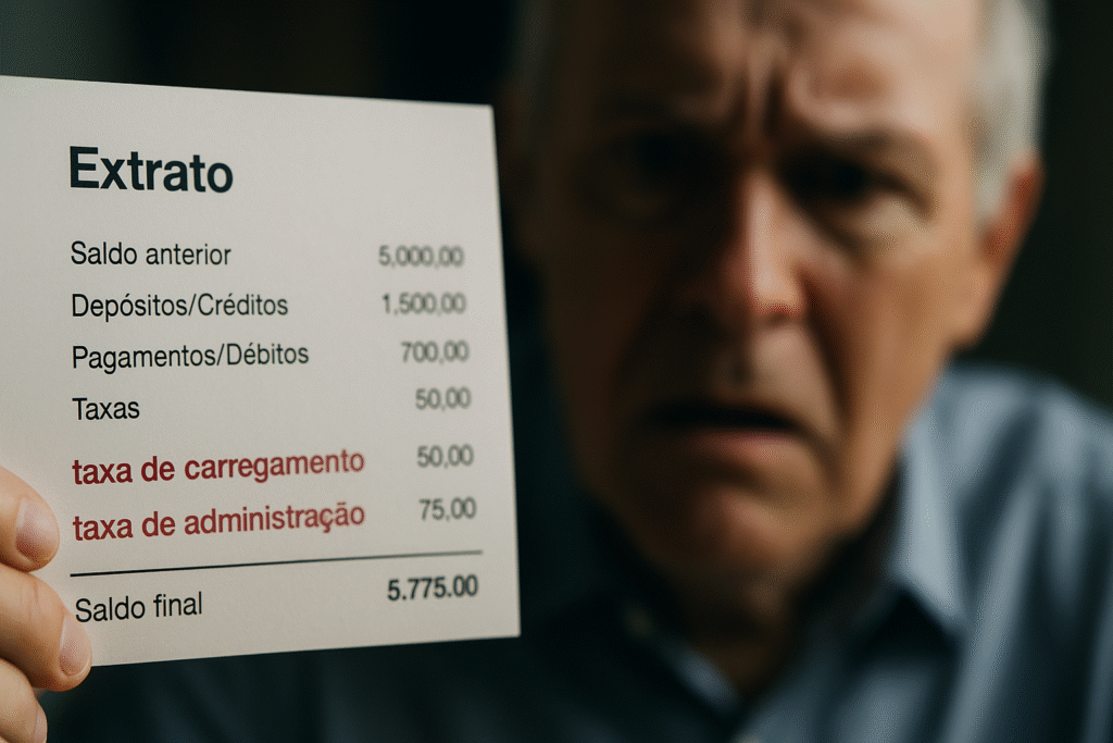 Algumas previdências cobram uma taxa de carregamento na entrada. Ou seja: toda vez que você faz um aporte, uma porcentagem dele já é descontada antes mesmo de começar a render. Se a taxa é de 5%, e você deposita R$ 1.000, apenas R$ 950 vão realmente para o seu plano. Os outros R$ 50 foram embora — para sempre.